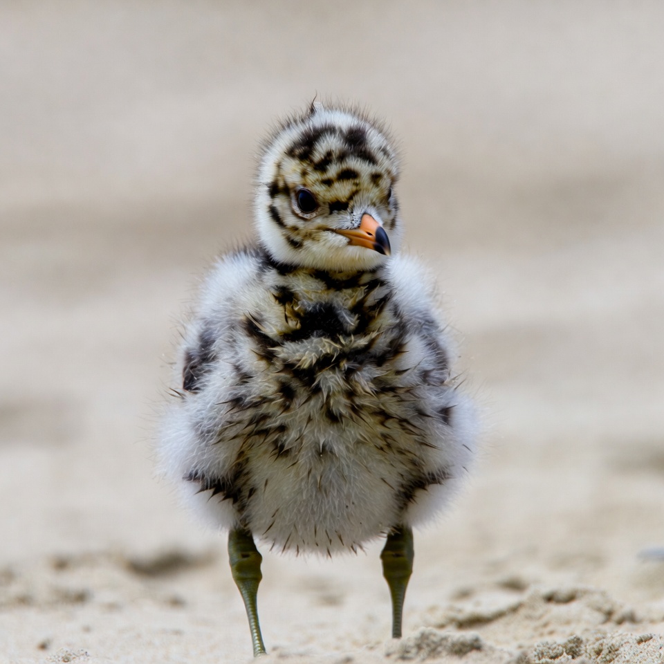 A young killdeer chick stands on a sandy beach with its fluffy feathers featuring black and white spots. It has a distinctive orange beak and green legs. The chick faces forward with a curious expression.