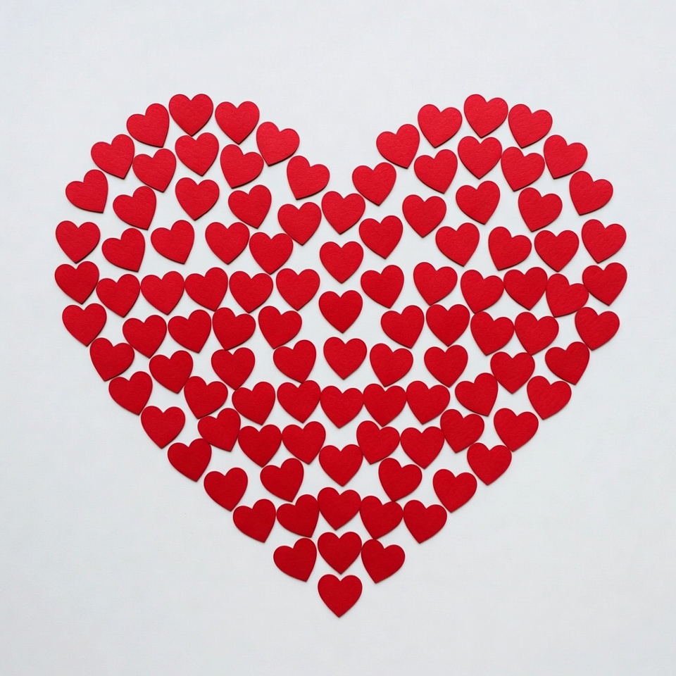 Numerous small red paper hearts are arranged to form a large heart shape on a white background. The hearts are densely packed, creating a solid red heart outline with subtle gaps. The composition is flat lay style with isolated white background.
