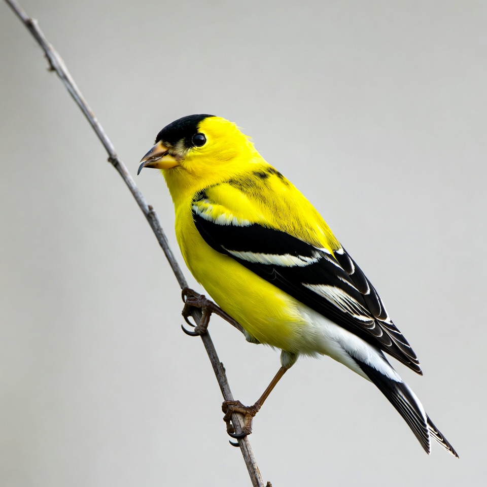 A vibrant yellow American Goldfinch with black wings and cap perches on a thin brown branch. Its beak is slightly open, and it faces to the side against a plain gray background. The bird's white wing patches and tail feathers are clearly visible.