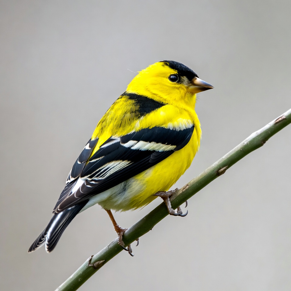 A vibrant American Goldfinch with bright yellow plumage and black wings perches on a thin branch. Its black cap and white wing bars stand out against the soft gray background. The bird faces slightly to the side with a small orange beak.