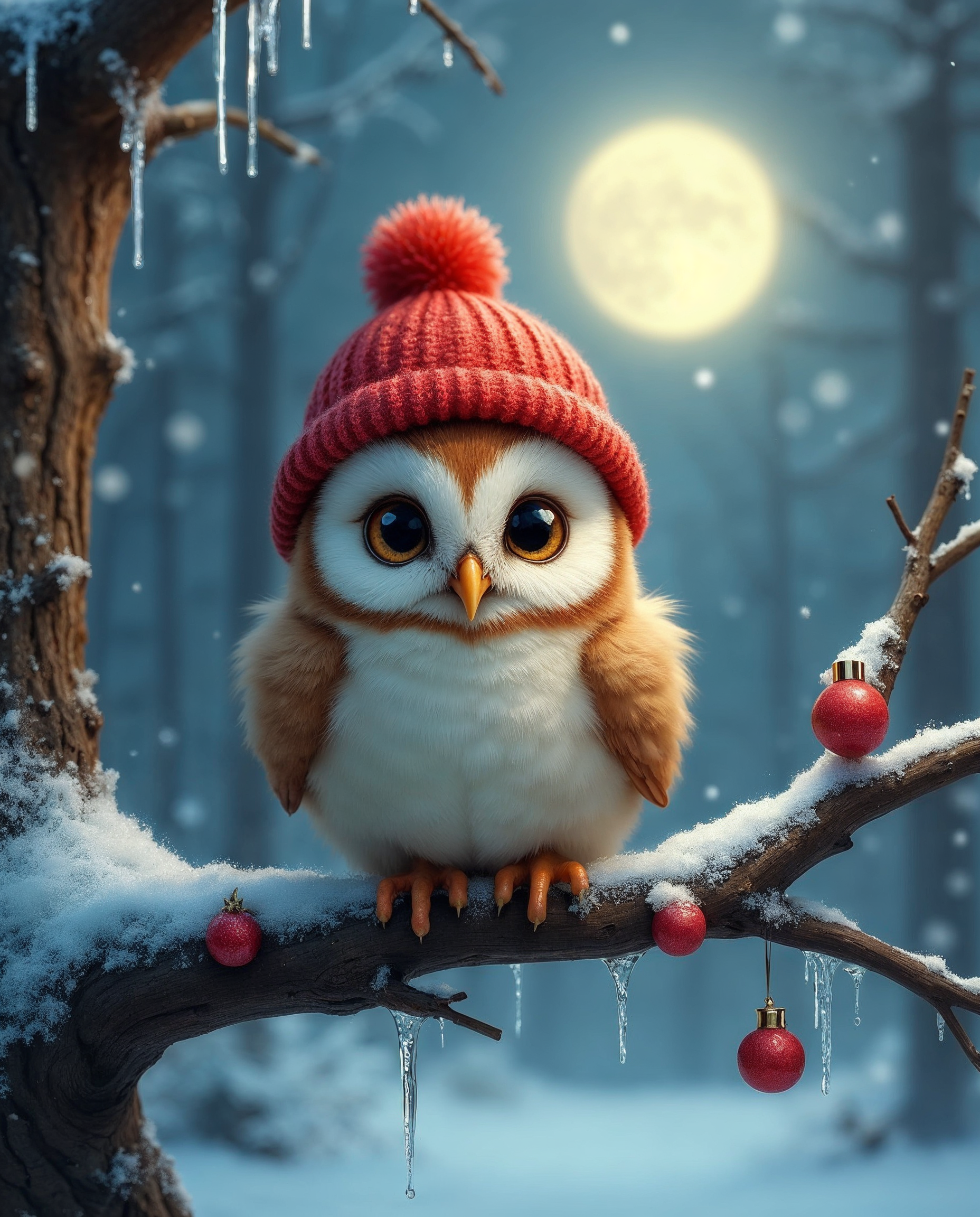 A cute brown and white owl with large eyes wears a red knit beanie with a pom-pom and perches on a snow-covered tree branch. Red Christmas ornaments hang from the branch beside icicles and snow. A full moon shines in the snowy forest background at night.