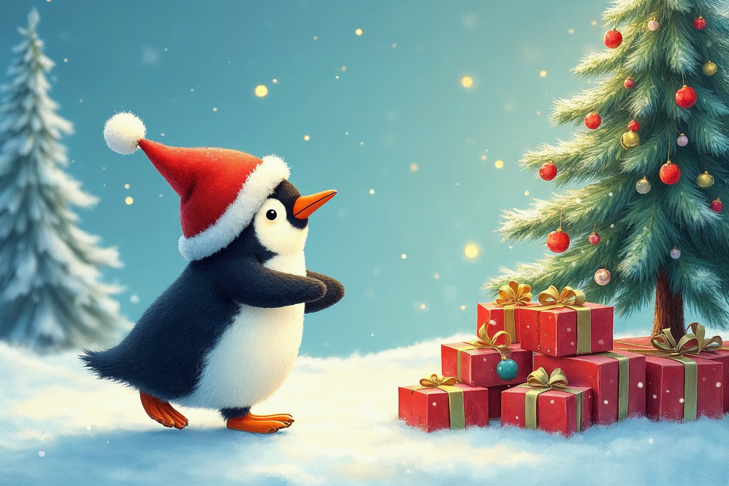 A cute cartoon penguin wearing a red Santa hat with white pom-pom stands on snowy ground next to a stack of wrapped Christmas presents. A decorated Christmas tree with colorful ornaments and lights is positioned nearby. The scene features a snowy landscape with pine trees and sparkling lights on a blue background.