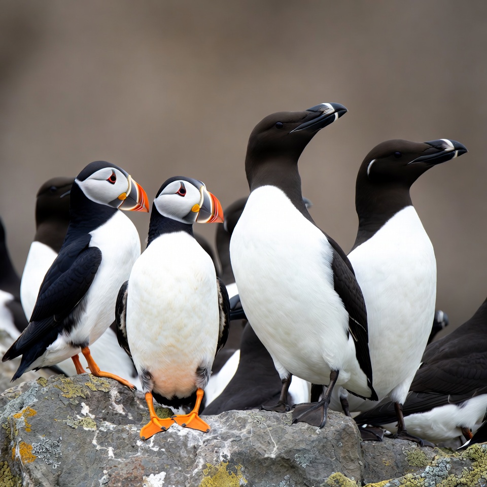 Atlantic puffins, beak, bird colony, birds, black white feathers, feathers, group of birds, lichen, nature, orange beaks, orange feet, outdoors, rocks, rocky surface, seabirds, standing puffins, wildlife, puffins