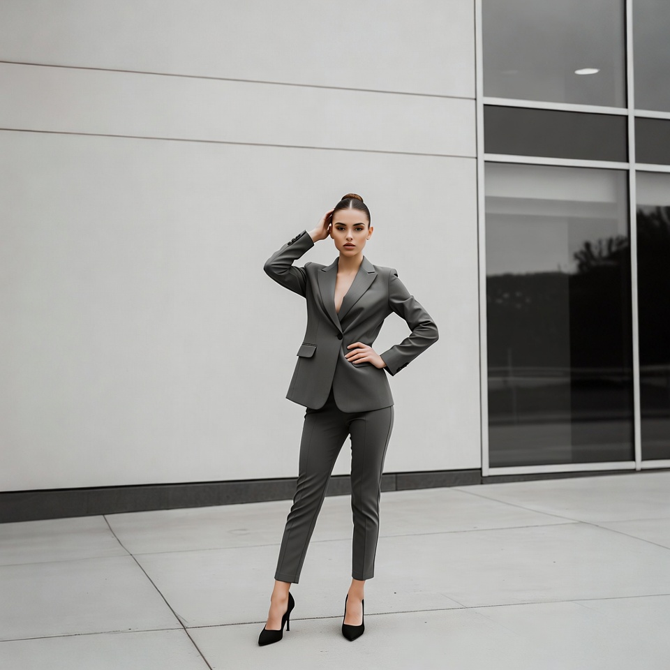 A young woman with long dark hair in a bun stands confidently in front of a modern glass building. She wears a fitted gray blazer and matching pants with black high heels, one hand touching her hair and the other on her hip. The background features a white concrete wall and large tinted windows.