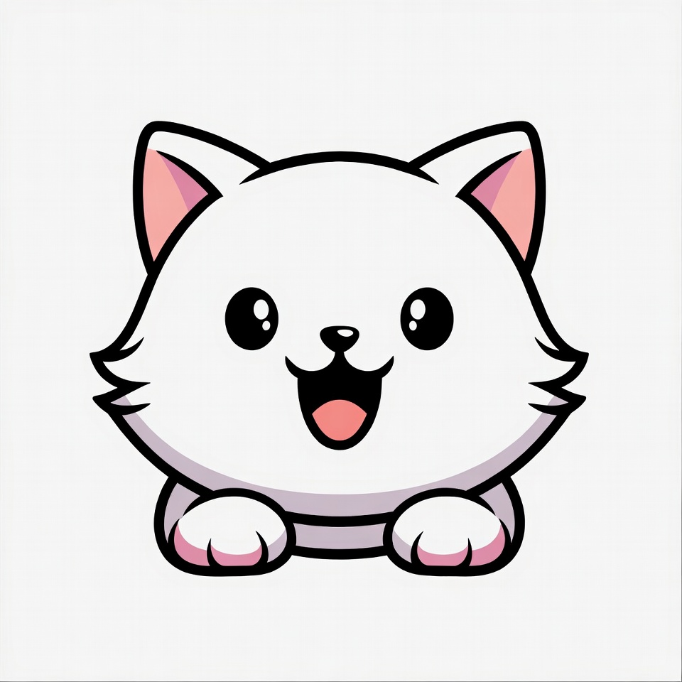 A kawaii-style white cat with large sparkling eyes and a wide happy smile peeks over an edge. It has pink inner ears, fluffy fur, and white paws with pink paw pads. The illustration features bold black outlines on a plain white background.