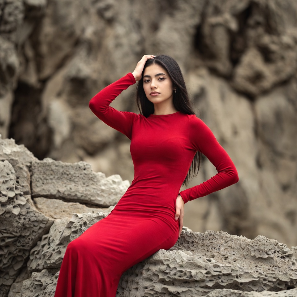 A young woman with long dark hair sits on rocky terrain wearing a form-fitting long red dress with long sleeves. She poses with one hand on her head and the other on her hip. The background features a rugged gray rock formation.