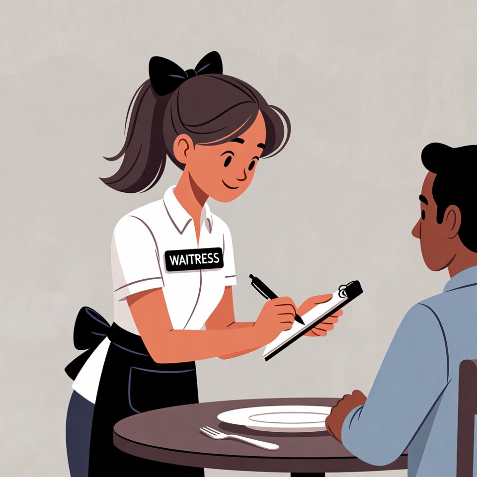 A smiling Asian waitress in a white shirt, black bowtie, and apron holds a notepad and pen while taking an order from a seated African-American man at a round table. The man wears a light blue shirt and sits in front of a plate with a fork. The scene is a colorful illustration on a light gray background.