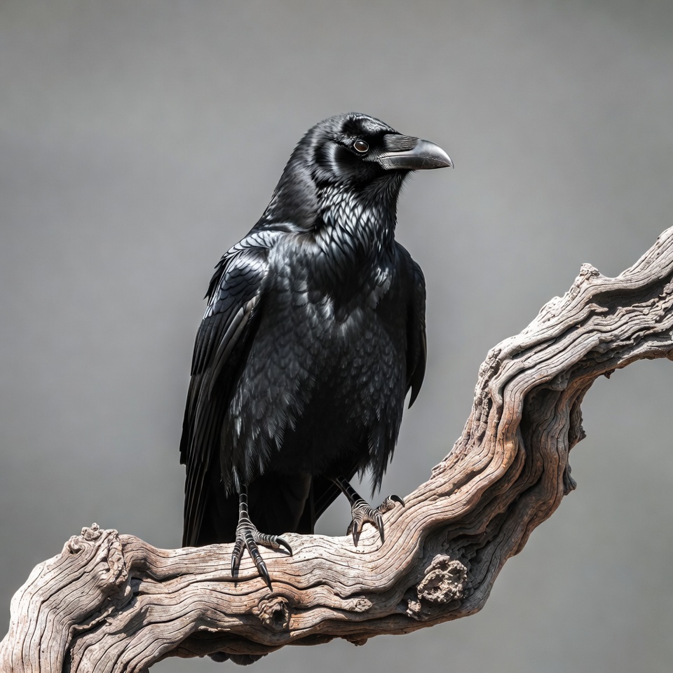 A large black raven with glossy feathers perches on a twisted, dry branch. Its sharp beak and intense eyes face forward against a gray background. The bird grips the branch firmly with its talons.