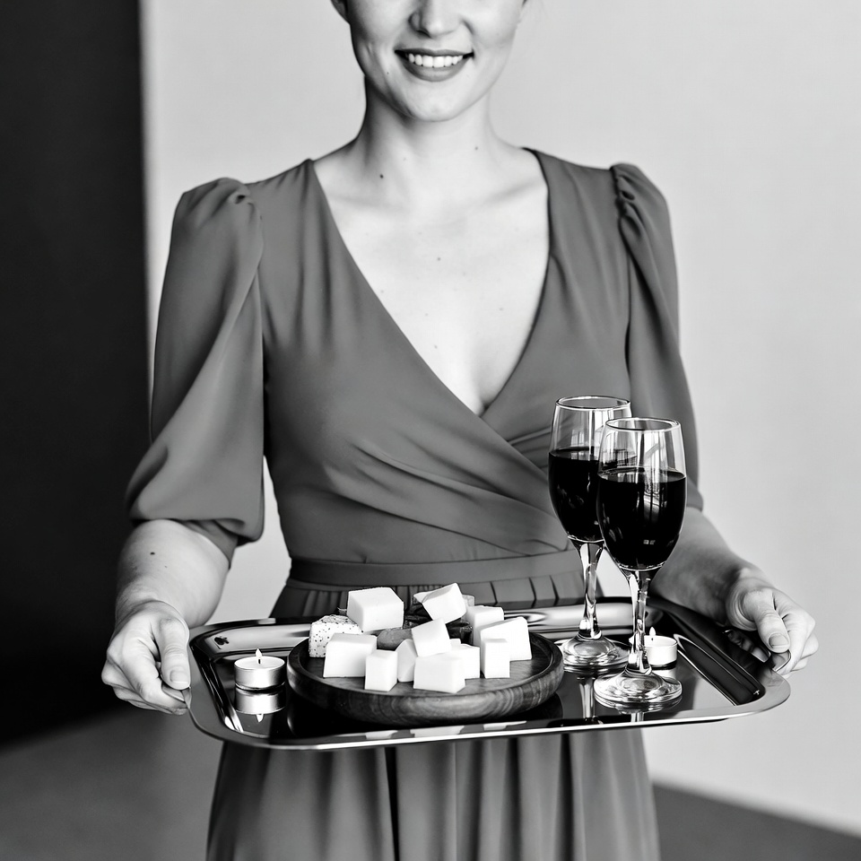 White, appetizer tray, black and white, candle, cheese cubes, female, food tray, holding tray, indoor, monochrome, party serving, red wine, silver tray, sleeved dress, smiling, standing, wine glasses, wrap dress, woman