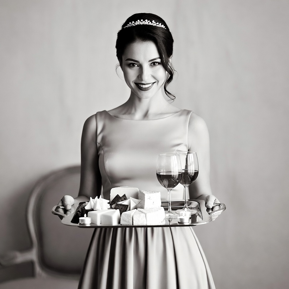 White, beige dress, black and white, cheese board, cheese cubes, cheese platter, elegant, female, food serving, isolated background, red wine, silver tray, smiling, studio portrait, tiara, updo hairstyle, white cheese, wine glasses, woman