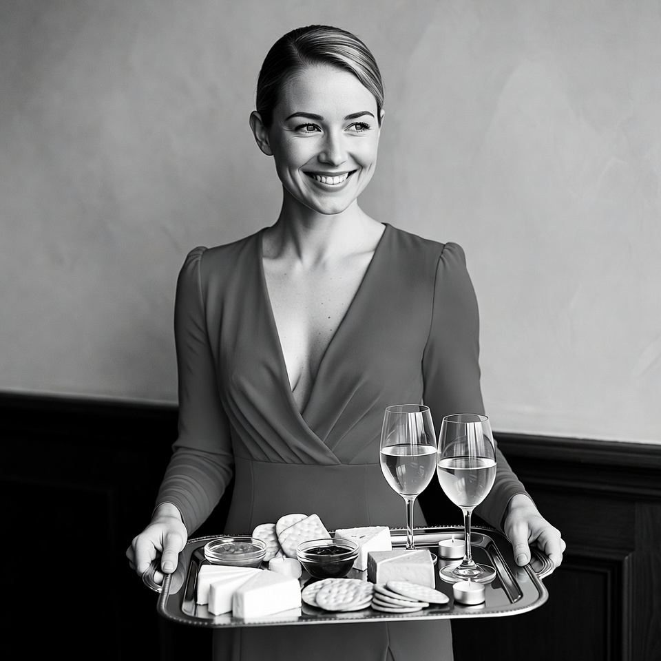 A smiling woman with blonde hair in a ponytail wears a sleeveless wrap dress and holds a silver tray. The tray features an assortment of cheeses, crackers, dips, and two wine glasses filled with white wine. She stands against a dark paneled wall in this black and white photo.