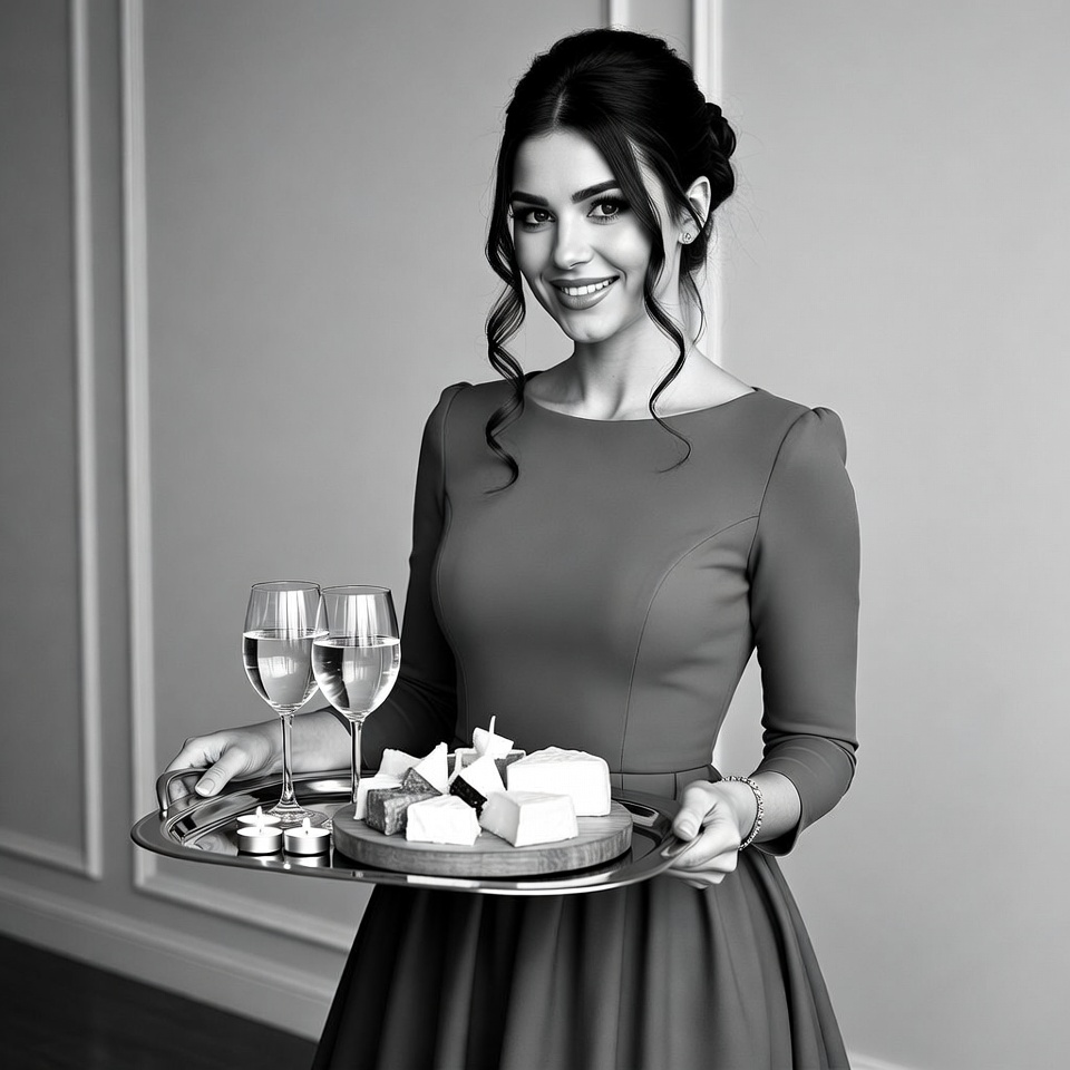 A smiling woman with dark hair in an updo holds a silver tray featuring cheese, crackers, and two glasses of white wine. She wears a fitted gray long-sleeve dress and stands against a light gray wall with decorative molding. Candles are placed on the tray among the food items.