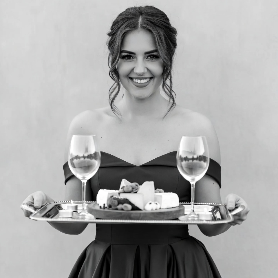 A smiling young woman with wavy brunette hair updo holds a silver tray featuring a cheese board with cheeses and berries. She wears an off-shoulder black dress and stands against a plain light background. Two stemmed wine glasses filled with white wine flank the platter on the tray.