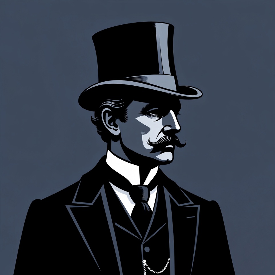 An illustration of a Victorian-era gentleman in profile view, wearing a black top hat, tailored suit, white collar, and tie. He sports a prominent mustache and curly hair, with a pocket watch chain visible. The artwork features bold black lines and shading on a dark blue background.