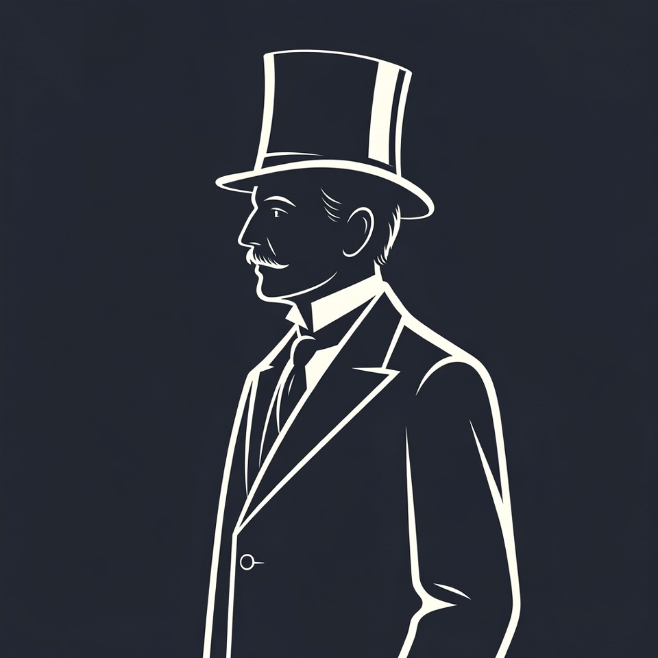 A silhouette illustration of a Victorian-era gentleman in profile view against a dark background. He wears a formal tuxedo with a bow tie and collar, a tall top hat, and a mustache. His pose is confident with hands at his sides.