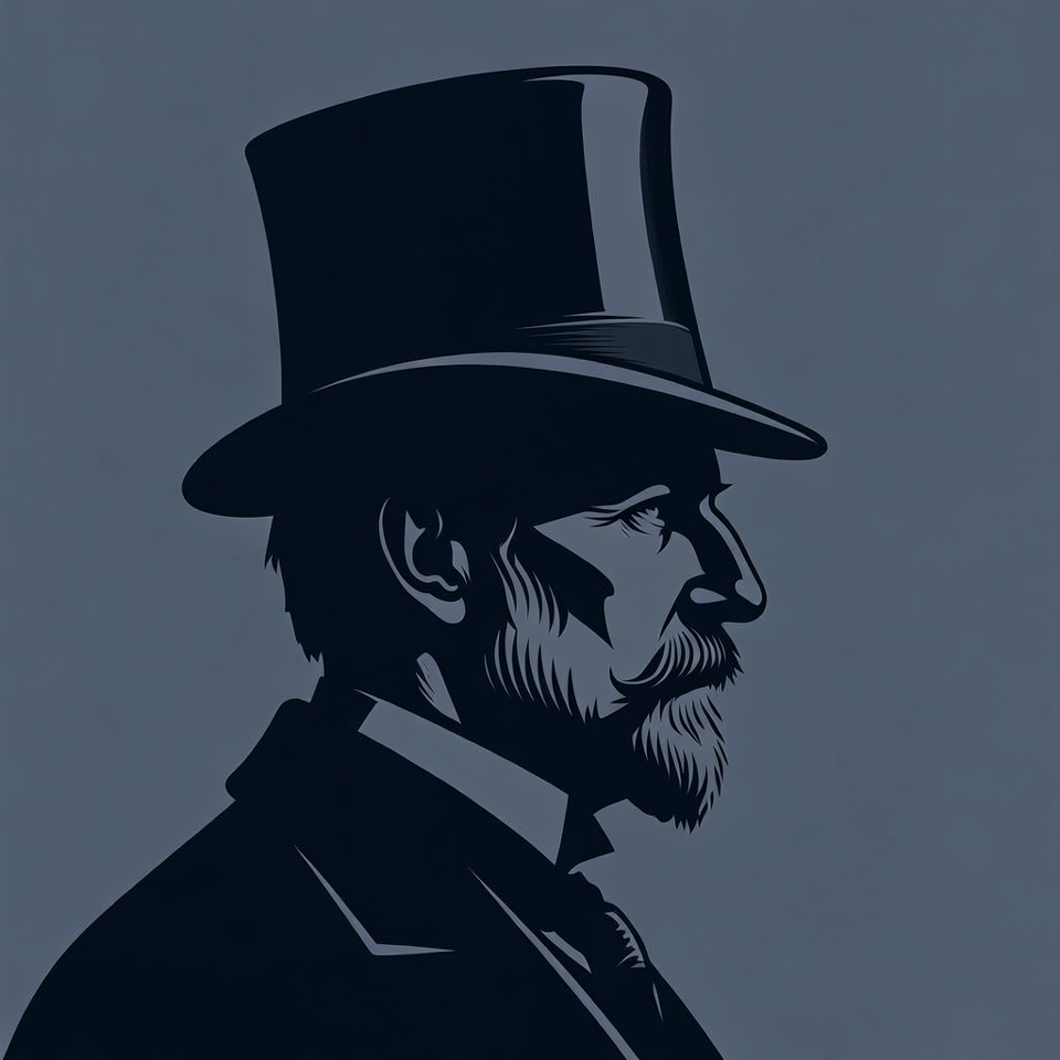 A black silhouette illustration of a Victorian-era man in profile view. He wears a tall top hat, formal suit with bow tie, and has a beard and mustache. The design features bold outlines on a gray background.