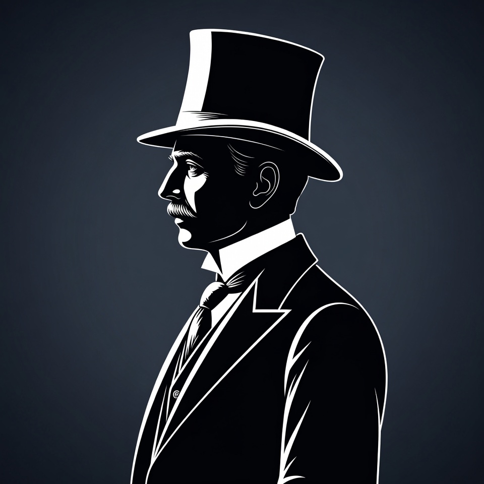 A black and white silhouette illustration of a Victorian-era man in profile view against a dark background. He wears a tall top hat, formal suit with vest and tie, and has a mustache. The image features clean line art with high contrast.