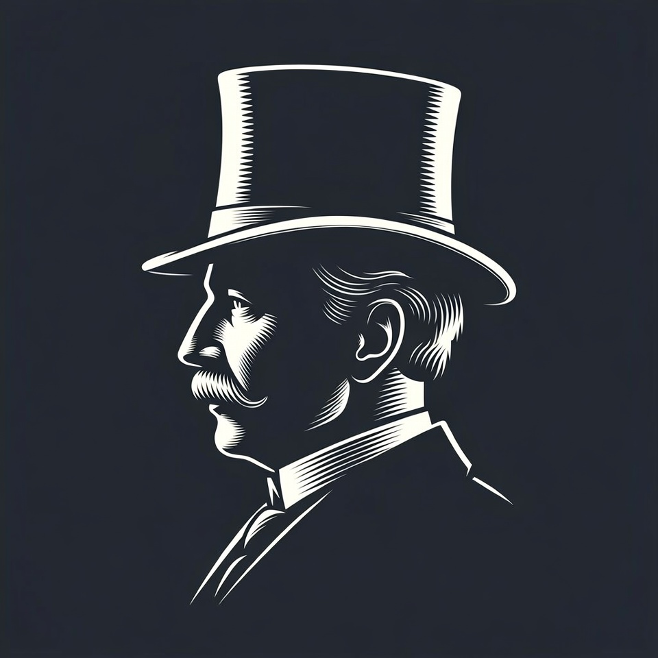 Victorian style, White, black background, collar shirt, elegant gentleman, engraving style, formal suit, historical figure, illustration, isolated background, line art, male, man, mustache, profile view, side profile, silhouette, top hat, vector art, vintage man, gentleman