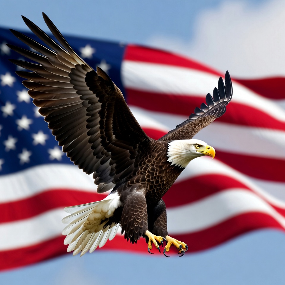 A majestic bald eagle with wide-spread wings soars in front of a waving American flag. The eagle features a white head, yellow beak, and dark brown body against a blue sky with clouds. The stars and stripes of the flag are prominently visible in the background.