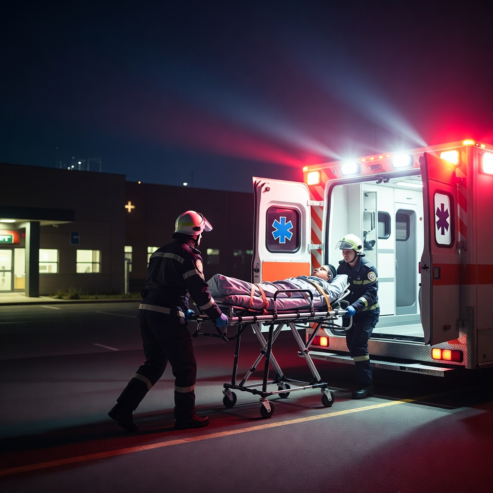 Two firefighters in full gear carry a stretcher with a patient toward an open ambulance at night. The scene is illuminated by red and blue emergency lights against a dark parking lot near a medical building. The ambulance doors are open, and the firefighters are focused on loading the patient.