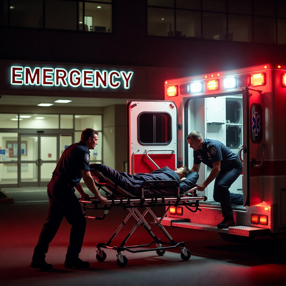 Two male paramedics in dark uniforms wheel a stretcher carrying a patient toward the emergency entrance at night. A red ambulance with flashing lights is parked nearby, and the illuminated 'EMERGENCY' sign glows above the glass doors. The scene is set outside a hospital building under nighttime conditions.