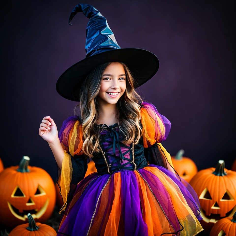 Halloween, Halloween witch, black hat, blonde hair, carved pumpkins, child costume, costume, dark background, isolated background, jack o lanterns, lace dress, orange accents, orange pumpkins, pointed hat, puffed sleeves, pumpkins, purple dress, smiling, tulle skirt, wavy hair, witch costume, young girl, girl