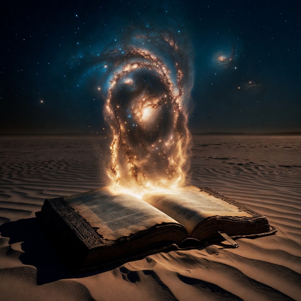 ancient tome, book illustration, book magic, cosmic energy, cosmic portal, desert landscape, desert sand, digital art, dunes, fantasy book, fiery glow, fire portal, galaxy portal, galaxy swirl, glowing energy, magic book, magic portal, mystical portal, nebulae, night sky, open book, open tome, sandy desert, space book, space vortex, starry sky, stars, swirling galaxy, ancient book