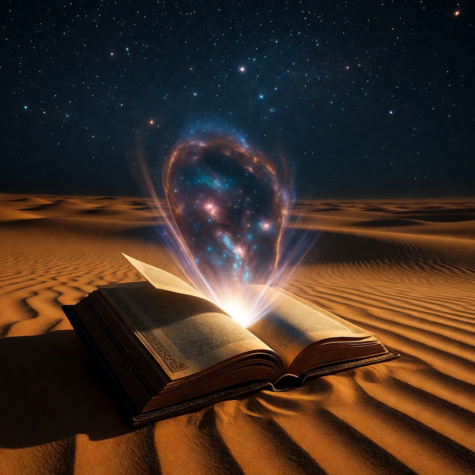 An ancient open book lies on sandy desert dunes under a starry night sky. A vibrant glowing nebula of cosmic energy bursts from its pages, forming a colorful ethereal ring. The scene blends mystical magic with starry cosmos and endless sand.