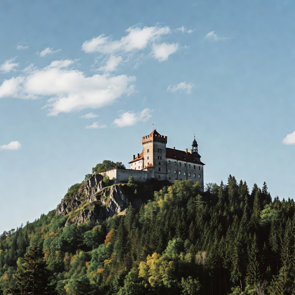 A medieval castle with towers and red roof sits atop a steep rocky hill surrounded by dense green and autumn forests. Fluffy white clouds dot the clear blue sky above the structure. The castle's light stone walls contrast with the vibrant trees below.
