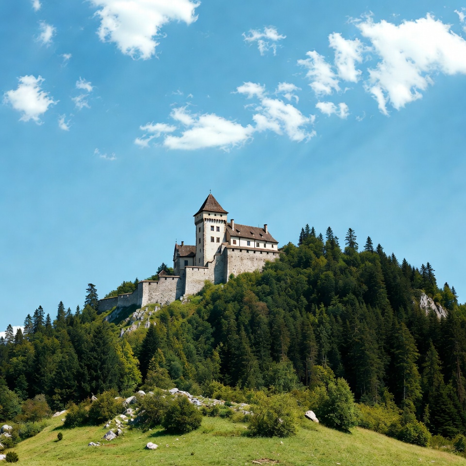 Europe, alpine scenery, architecture, battlements, blue sky, forest, fortress, green hill, hilltop castle, historic building, landscape, medieval castle, mountains, pine trees, rocky slope, stone castle, tower, white clouds, castle