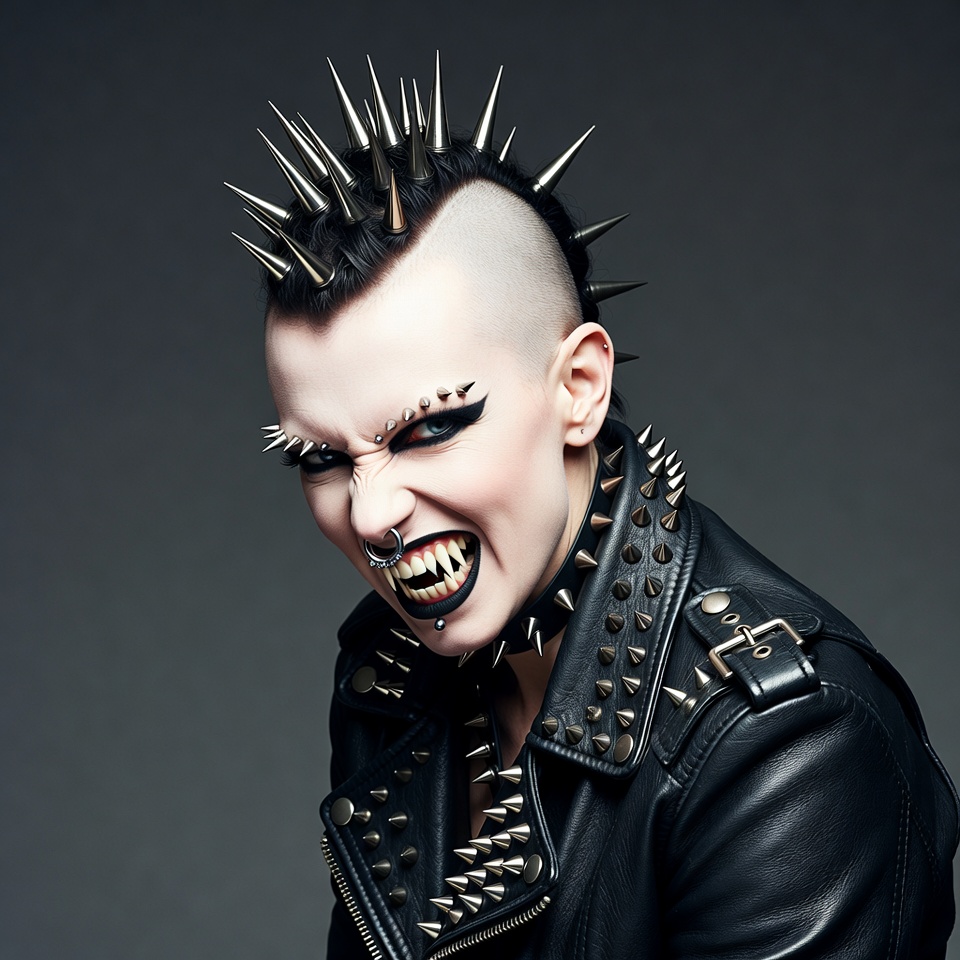 White, aggressive pose, black leather, cyberpunk, dark background, edgy style, facial spikes, fangs, fierce expression, goth woman, heavy makeup, leather jacket, mohawk, mohawk hairstyle, punk fashion, punk rock, snarling face, spiked hair, spikes, studded jacket, woman, punk woman