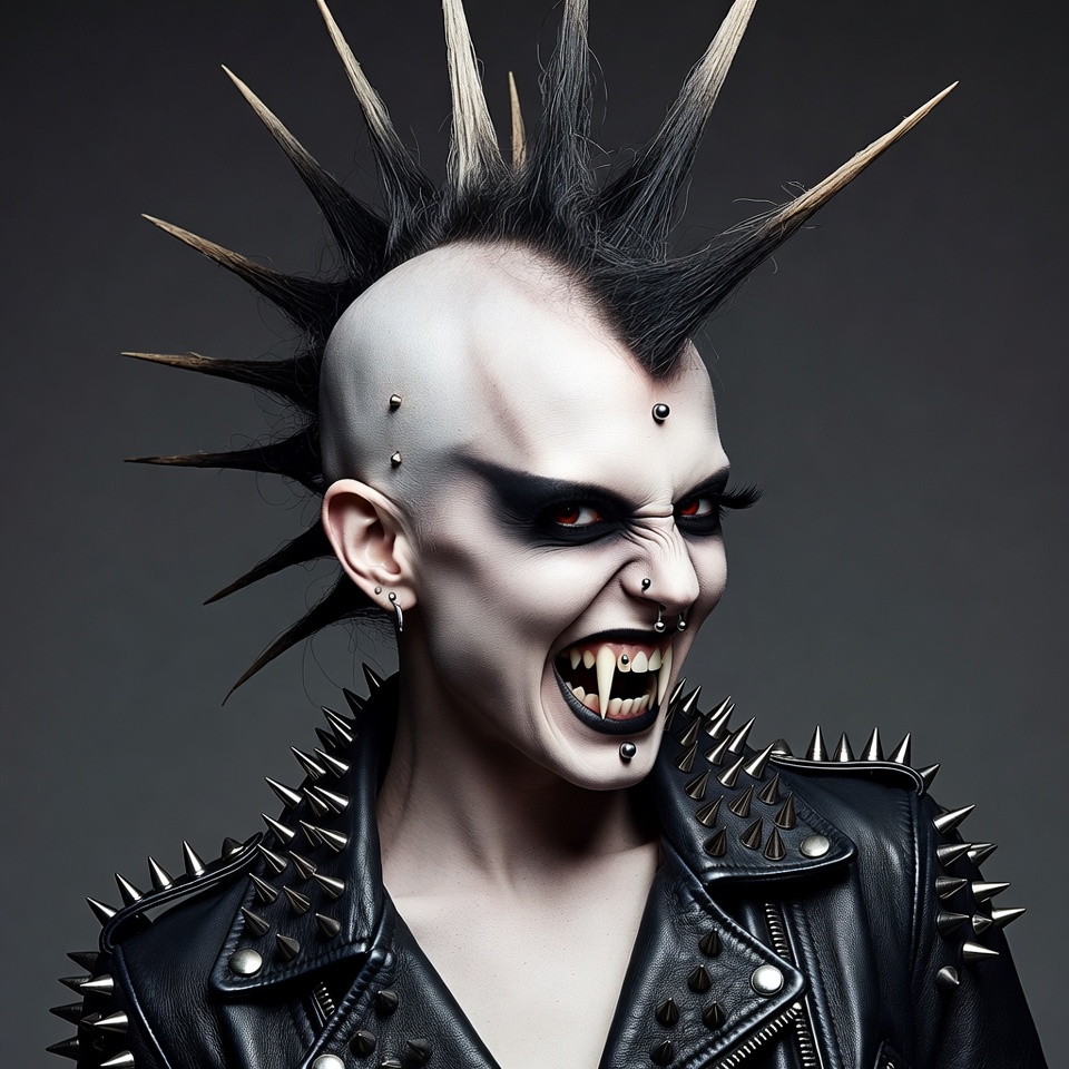 White, aggressive expression, black lipstick, dark background, facial piercings, fangs, female, goth, leather jacket, mohawk, piercings, shaved head, snarling, spiked hair, spikes, vampire, white makeup, punk woman
