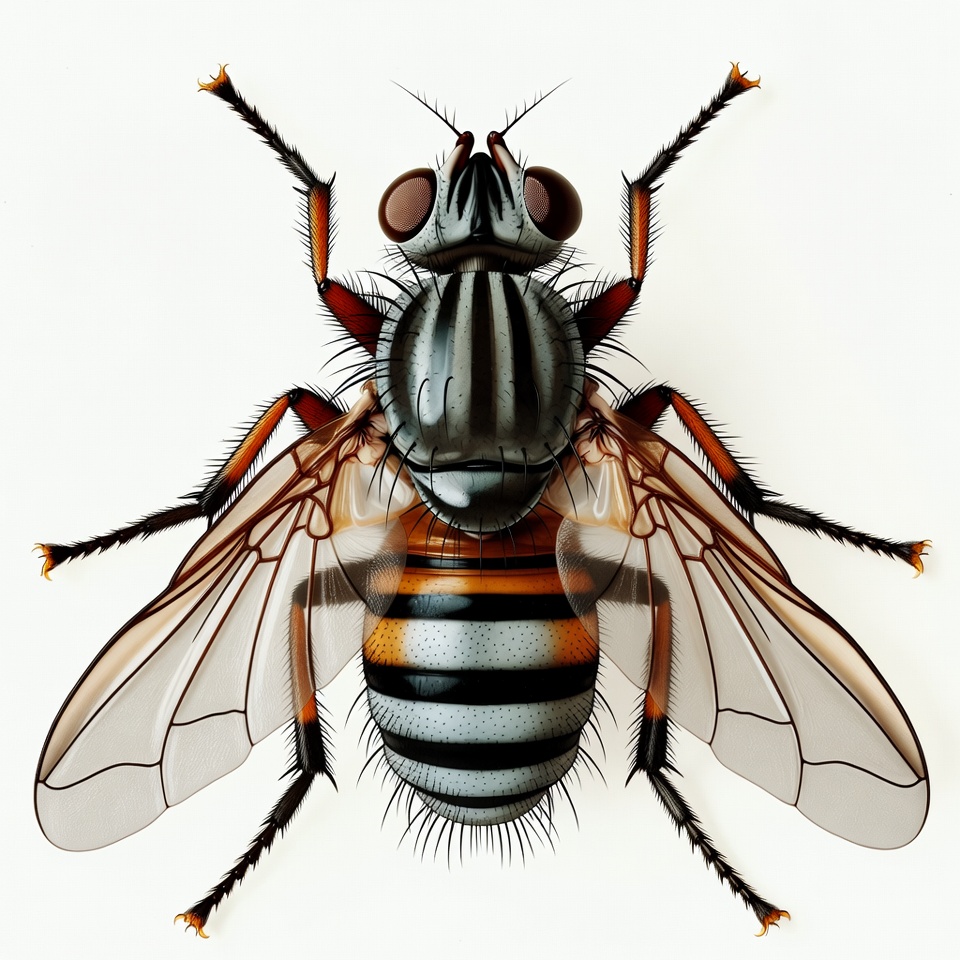 arthropod, compound eyes, detailed, digital art, entomology, fly, illustration, insect, isolated background, legs, macro, striped abdomen, white background, wings, housefly