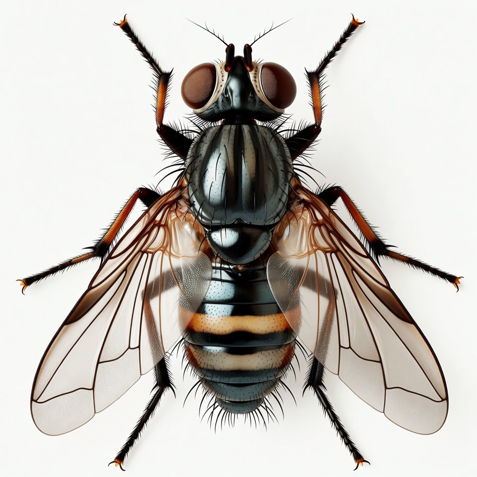 antennae, arthropod, black body, close-up, compound eyes, detailed, diptera, fly, hairy legs, insect, legs, macro photography, orange stripes, red eyes, striped abdomen, translucent wings, white background, wings spread, house fly