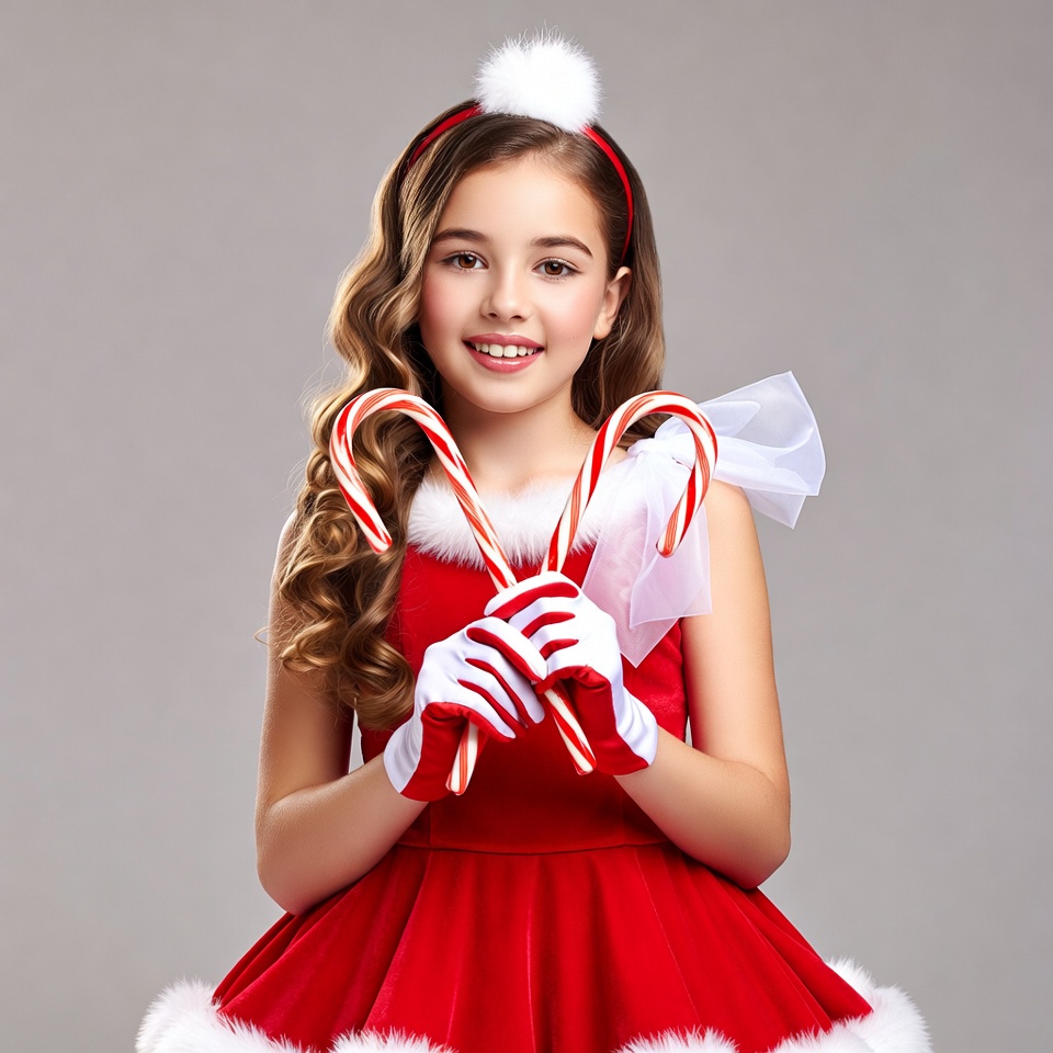 Christmas, Santa dress, White, brown hair, candy canes, female, fur trim, gray background, headband, holding candy canes, pom-pom, red dress, smiling, wavy hair, white gloves, young girl, girl