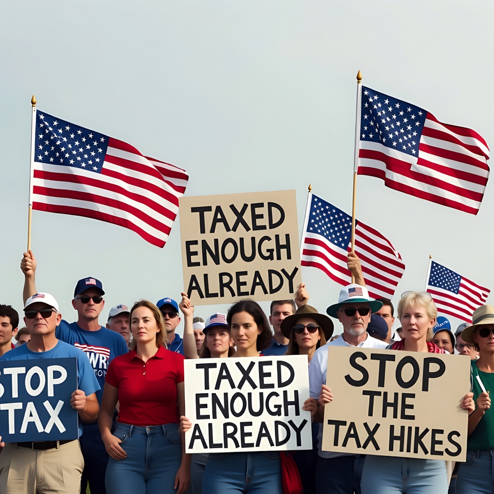 A large group of diverse men and women holds signs reading 'Taxed Enough Already' and 'Stop Tax Hikes' during a protest. They wave numerous American flags and wear casual clothing including jeans, red shirts, and hats. The crowd stands closely together outdoors under a clear sky.