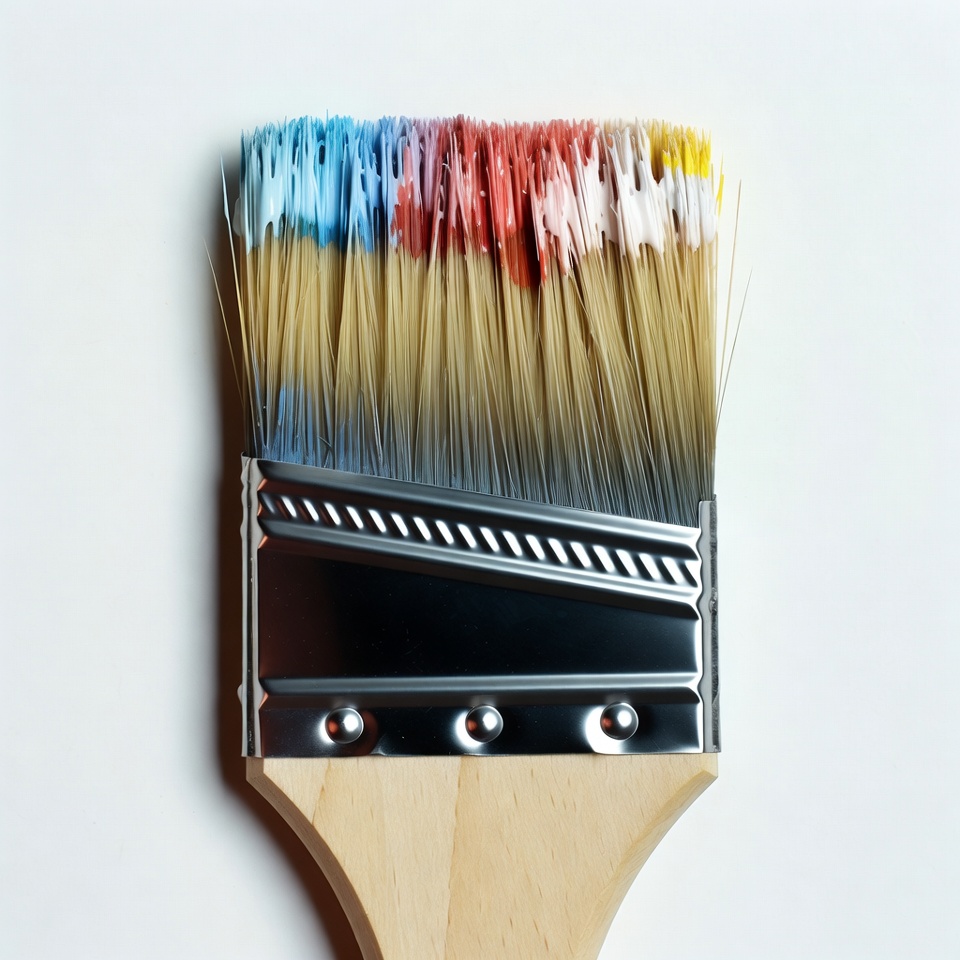 art supplies, art tool, artist brush, blue paint, colorful paint, craft tool, isolated background, metal ferrule, multicolored bristles, paint brush, painting brush, red paint, white paint, wooden handle, yellow paint, paintbrush