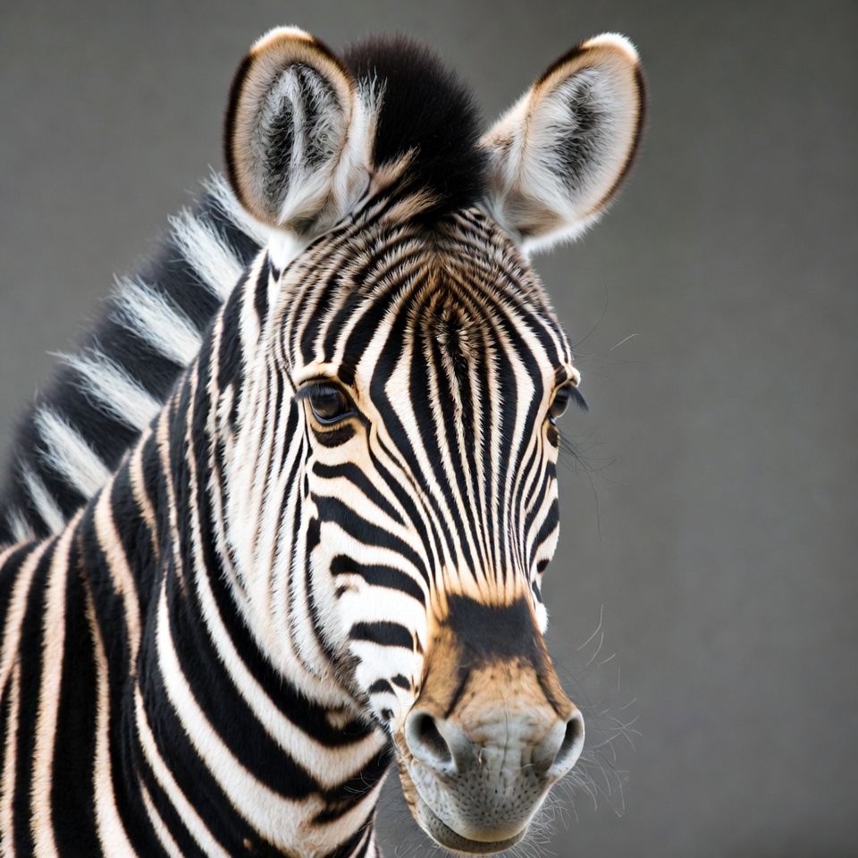 animal, black white, brown eyes, close-up, ears, equine, eyes, gray background, headshot, isolated background, mammal, muzzle, portrait, safari, striped pattern, stripes, wild animal, wildlife, zoo, zebra
