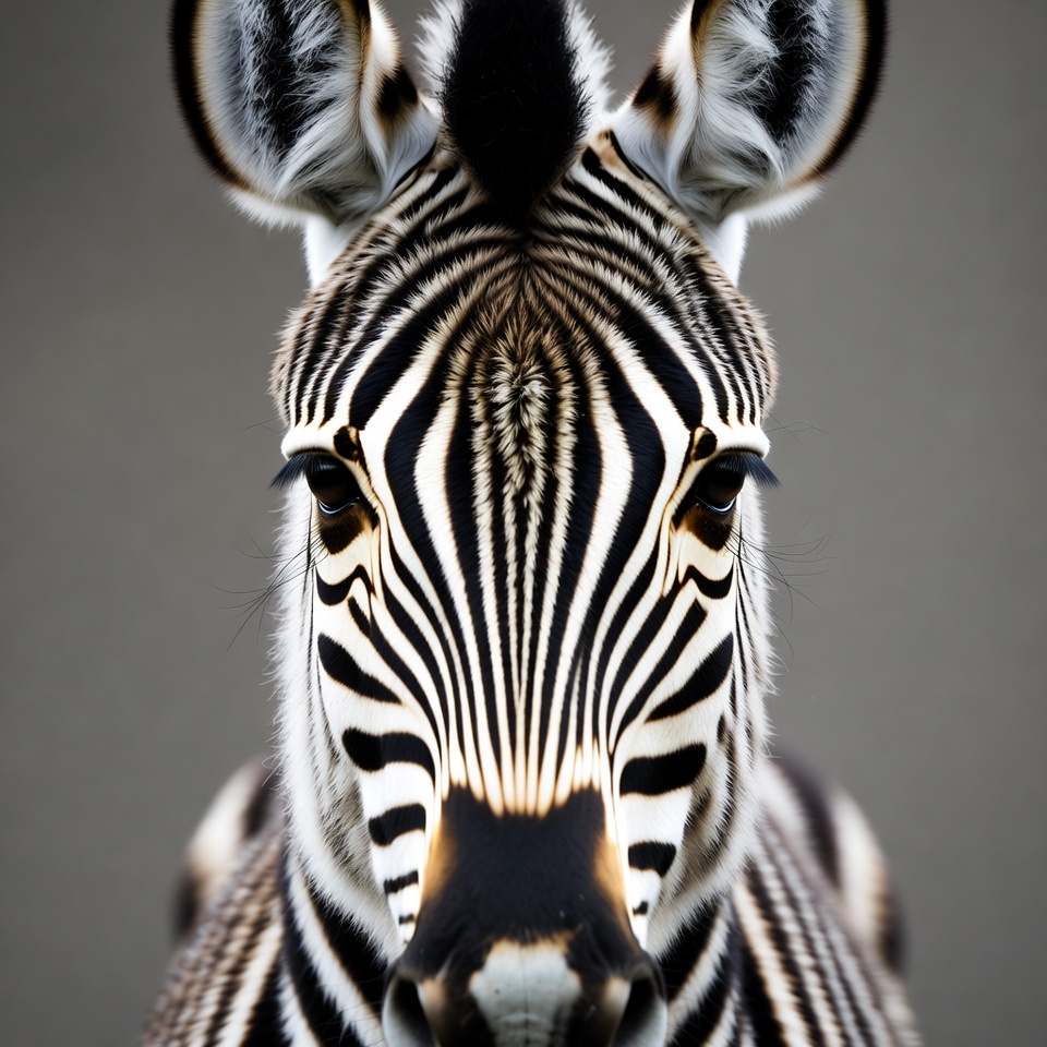 A zebra's face is captured in a close-up portrait with bold black and white stripes across its muzzle and forehead. Its large dark eyes gaze directly at the camera, framed by fluffy ears and a tufted mane. The animal stands against a plain gray background.