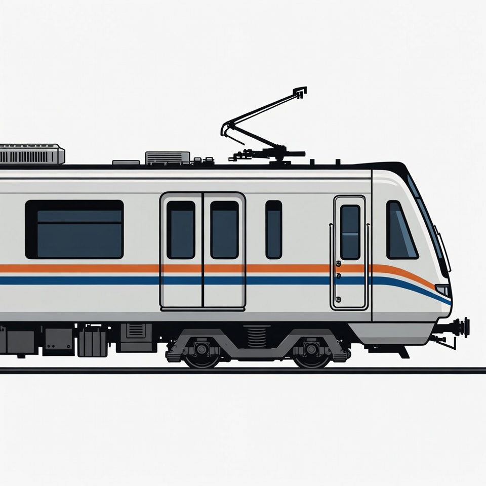 clipart, commuter train, electric train, isolated background, line art, modern train, orange stripes, pantograph, rails, railway, side view, subway train, train illustration, transit, transportation, vector graphic, white train, train