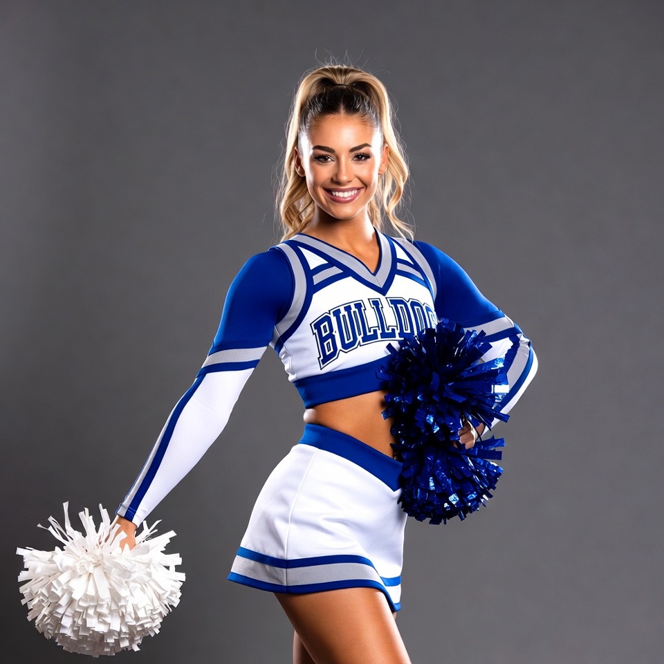 Bulldogs cheerleader, White, athletic wear, blonde hair, blue pom poms, blue uniform, cheerleading uniform, crop top, female cheerleader, gray background, pom poms, ponytail, posing, short skirt, smiling, team spirit, white pom poms, white skirt, woman, young woman, cheerleader