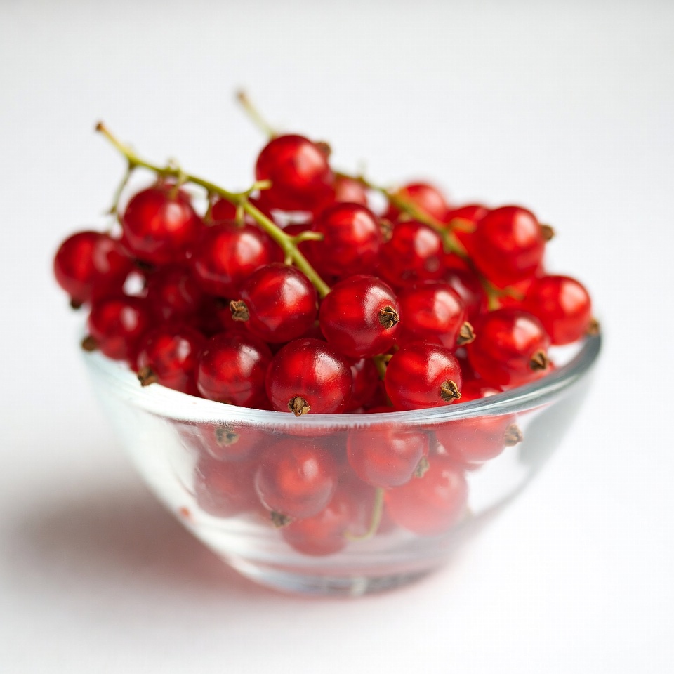 A cluster of fresh red currants with stems is piled in a clear glass bowl. The vibrant red berries glisten against the white background. Thin green stems extend from the bunch.