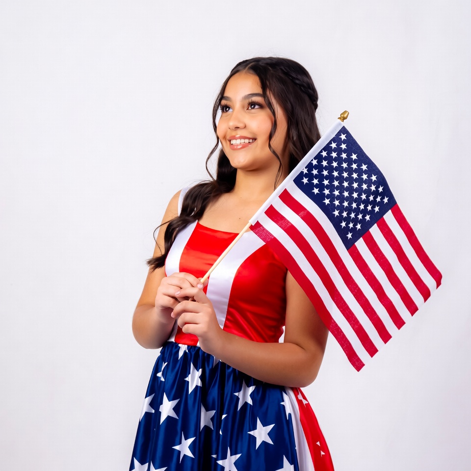 American flag, Fourth of July, Independence Day, Latino, USA flag, dark hair, dress, female, flag, girl, happy expression, long hair, patriotic dress, ponytail, portrait, red white blue, smiling, stars and stripes, white background, young woman, Latina girl