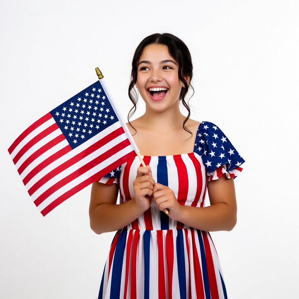 A young Latina girl with dark hair styled in loose waves smiles excitedly while holding a large American flag. She wears a patriotic dress featuring red and white stripes with blue star accents on the sleeves. She stands against a plain white background.