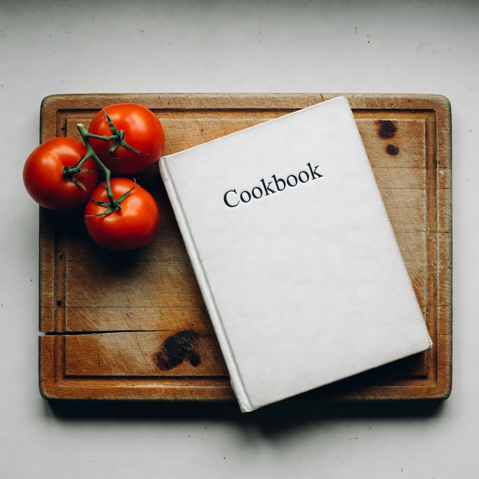 A white open cookbook lies on a wooden cutting board. Fresh red tomatoes with green stems are placed beside it. The setup is viewed from above on a light surface.