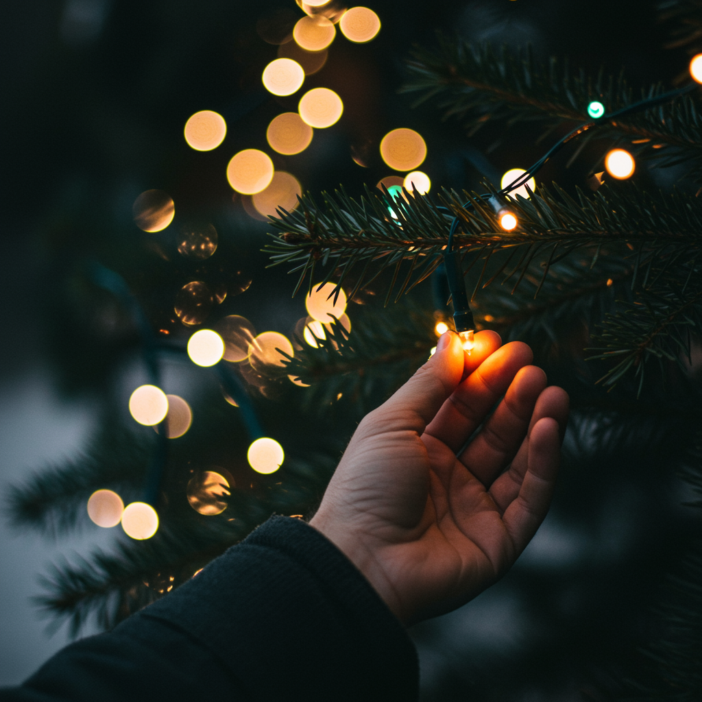 Christmas decoration, Christmas lights, blurred background, bokeh lights, dark sleeve, evergreen branches, festive decoration, fir tree, glowing bulb, green lights, hand, hand touching, holiday lights, holiday season, illuminated tree, light strands, lighting lights, night lights, pine needles, string lights, tree lights, warm glow, winter holiday, yellow lights, Christmas tree