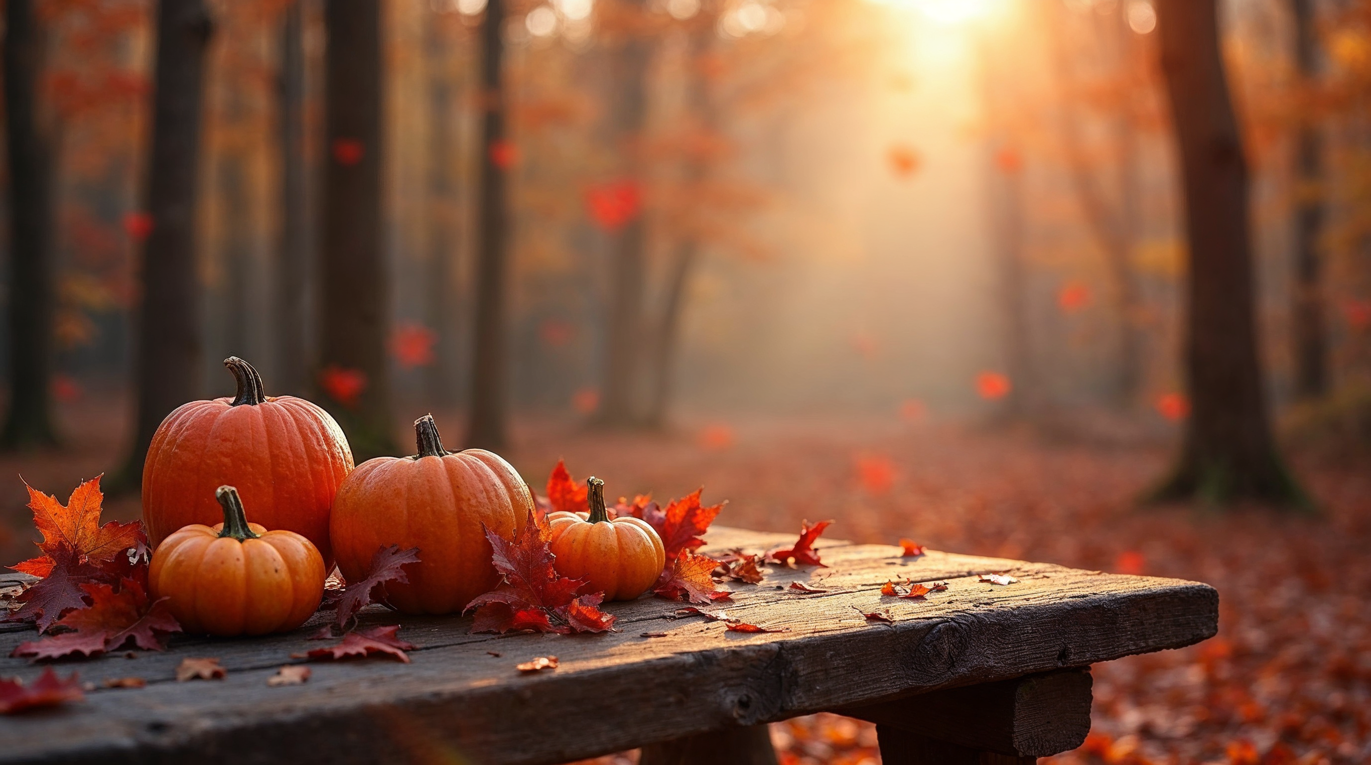Several orange pumpkins sit on a wooden table in a foggy autumn forest. Red fall leaves are scattered around the pumpkins and cover the ground. Sunlight filters through the trees, creating a warm glow in the background.