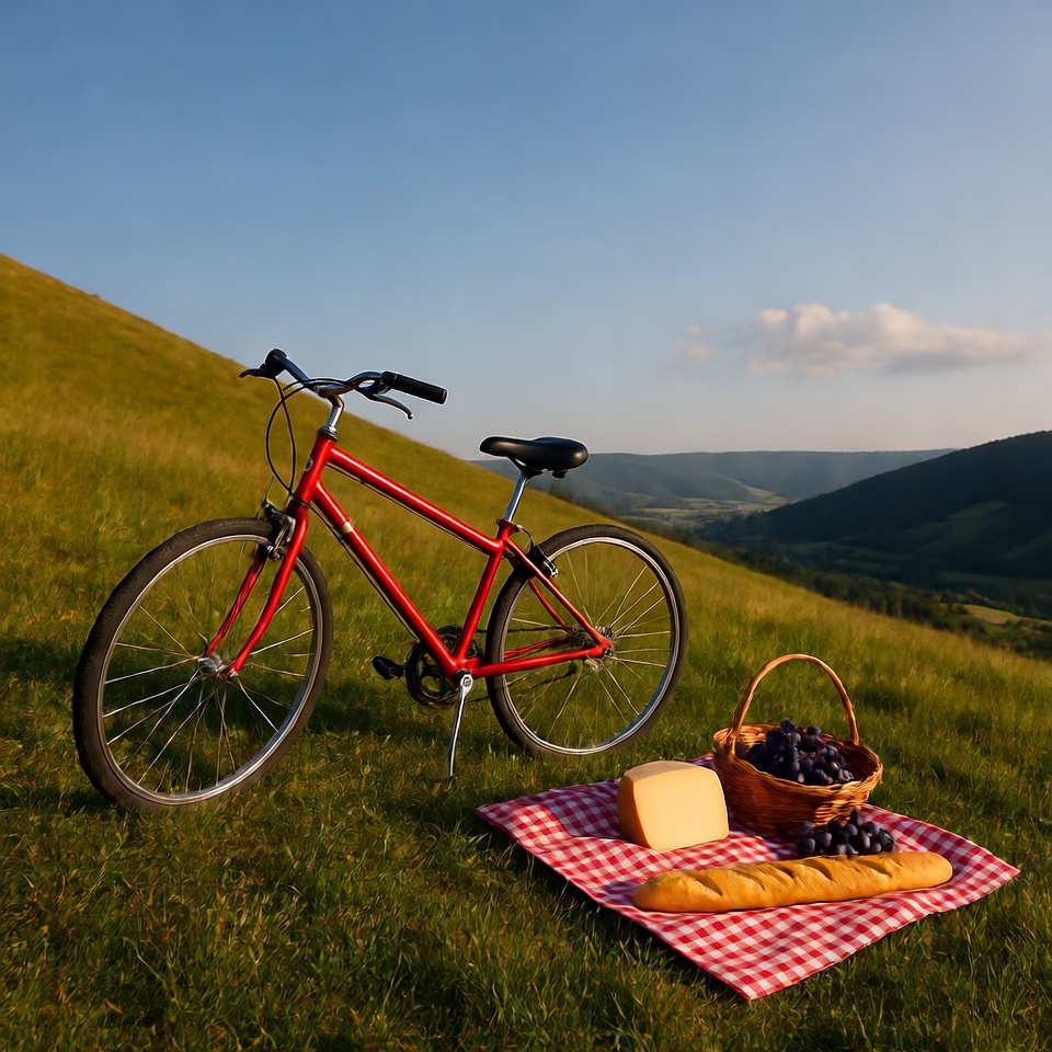 A red bicycle leans on a grassy hillside overlooking rolling green valleys under a clear blue sky. Next to it sits a red checkered picnic blanket with a wicker basket of grapes, a block of cheese, and a baguette. Scattered clouds dot the bright sky in the background.