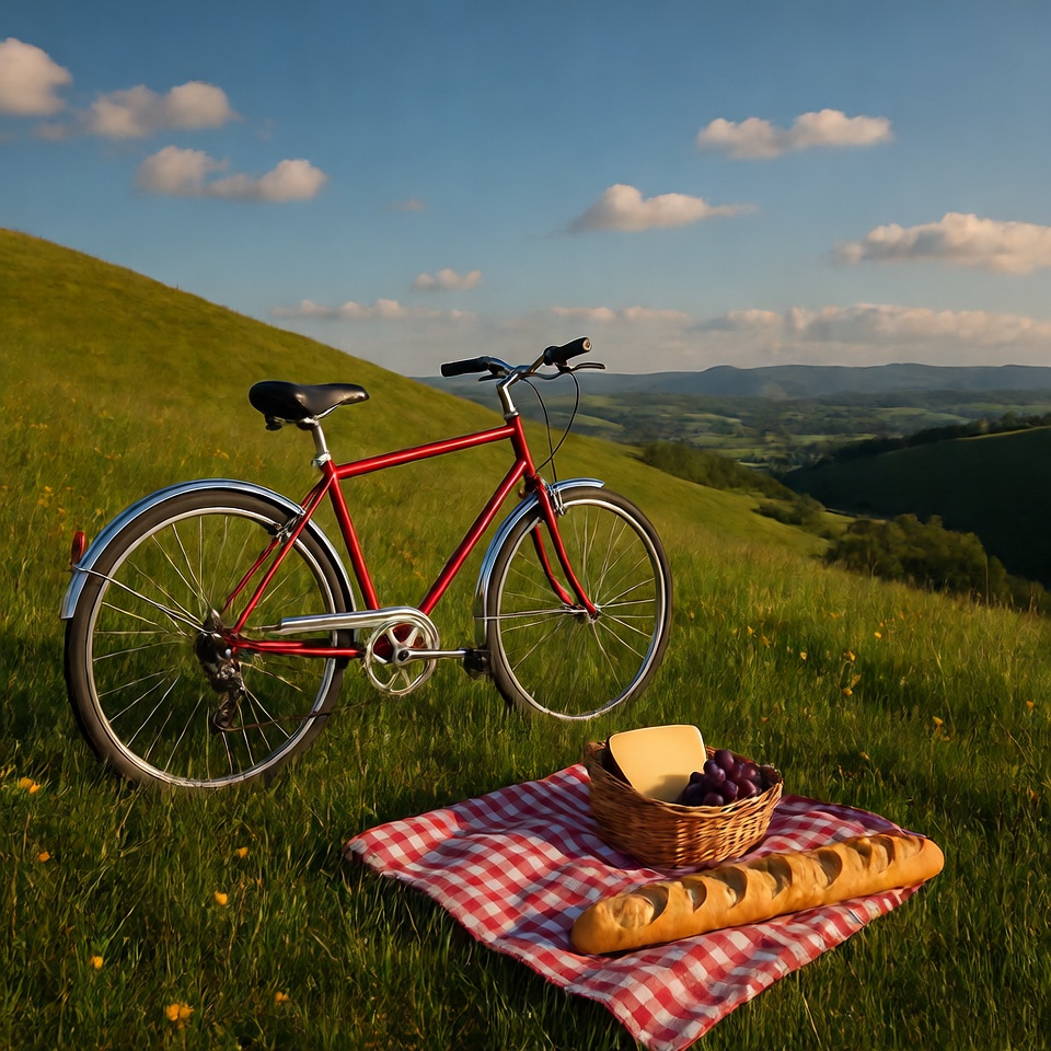 A red road bicycle stands on a grassy hill overlooking rolling green valleys under a blue sky with clouds. Next to it, a red-and-white checkered picnic blanket holds a wicker basket with grapes and cheese, baguettes, and a cloth. The scene features a scenic landscape with distant hills and golden-hour sunlight.