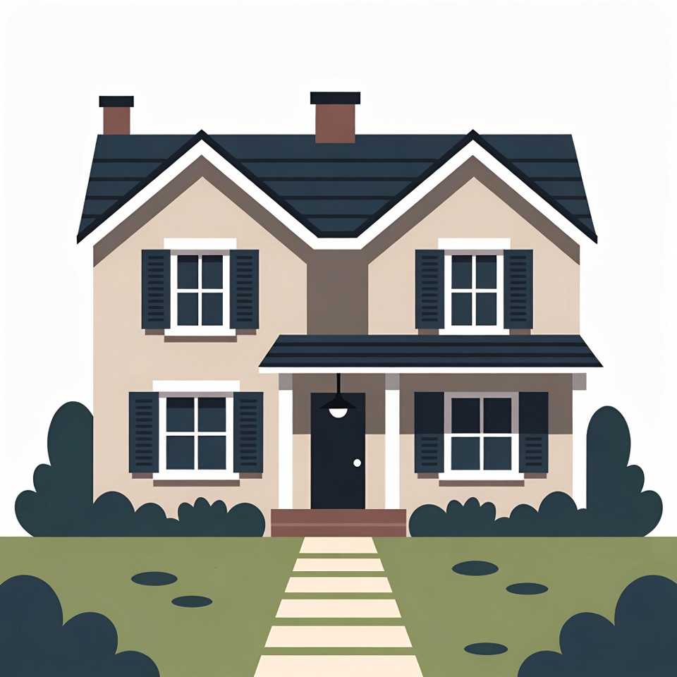 A simple illustration of a two-story beige house with dark blue roof and black shutters on the windows. It features a covered porch with a front door and lantern, flanked by green bushes. A stone pathway leads from the green lawn to the house entrance.